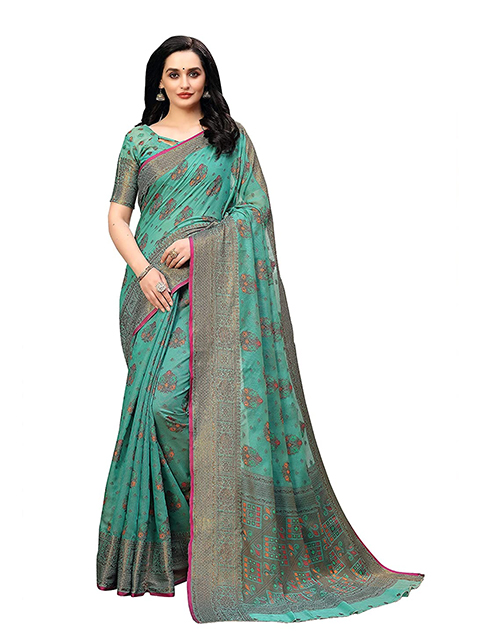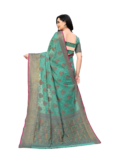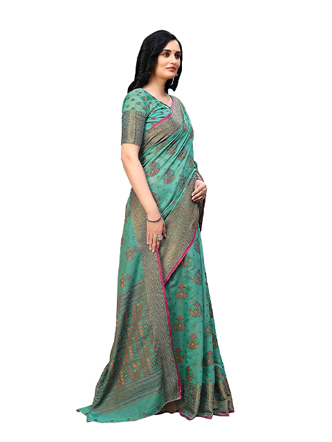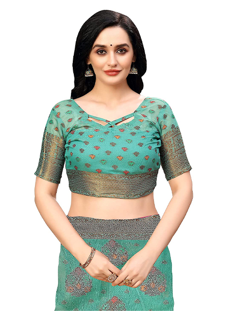 Sea green banarasi saree with woven design. The model is wearing a blouse from our stylist's collection. See the image for a mock-up. An unstitched blouse comes with the saree.