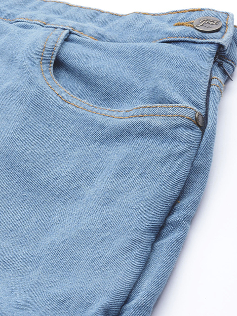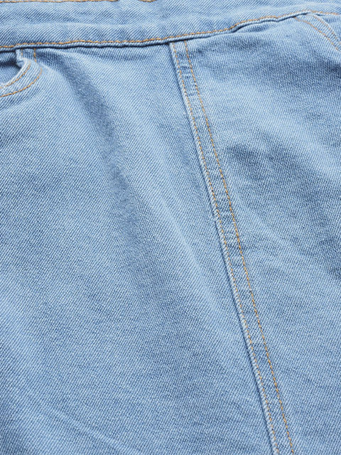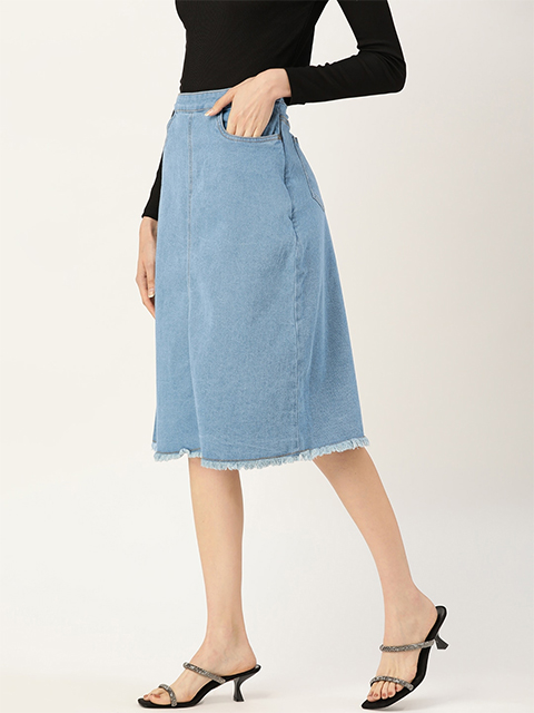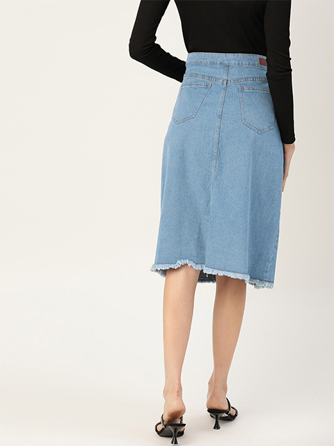 The Skirt Is Made Of Blue Woven Denim, Has Three Pockets, Three Button Closures, And A Flared Hem