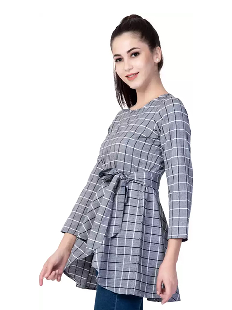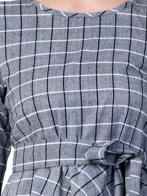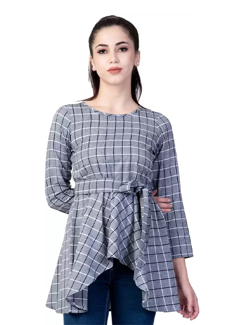 A black Checkered top crafted in cotton features a collar neck, 3/4th roll-up sleeves, a curved hemline, and a regular fit.