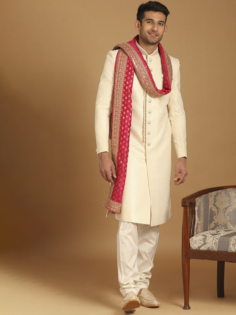 Wear this sherwani set to show off your style! Cream is the color of this exquisite sherwani set. Style this piece with your favorite accessories and head out to any event.