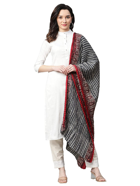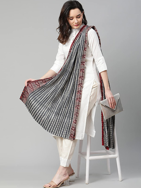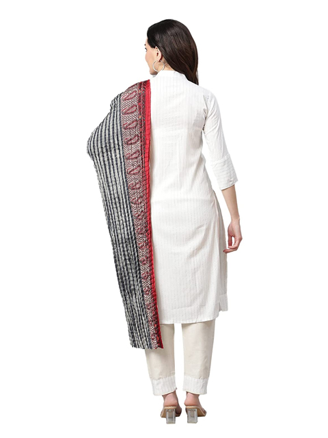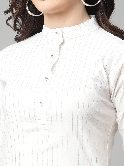 You can never go wrong with a simple and chic off white kurti. It has a round neckline with quarter sleeves and side slits. The kurta has a front button placket that provide ease to wear. The placket and edges of the sleeves have a gota patti lace detailing to give it a subtle spark.