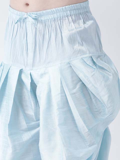 Blue printed kurta with patiala, Blue straight knee length kurta, has a round neck, long sleeves, curved hem, multiple slits. Blue solid patiala has elasticated waistband, drawstring closure.