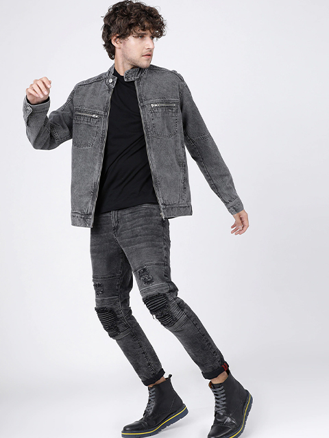 Top off your personal wardrobe with this trendsetting grey jacket. When you're going to a concert with your buddies, layer your favourite tee with this jacket.