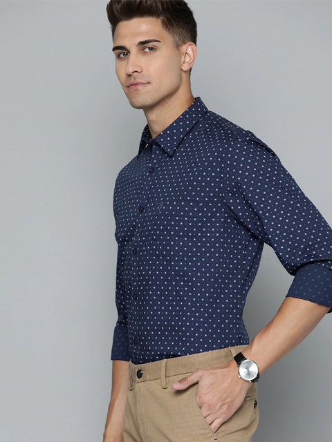 Navy blue and geometric printed opaque Casual shirt, has a spread collar, button placket, 1 patch pocket, regular long sleeves, curved hem