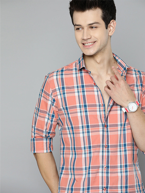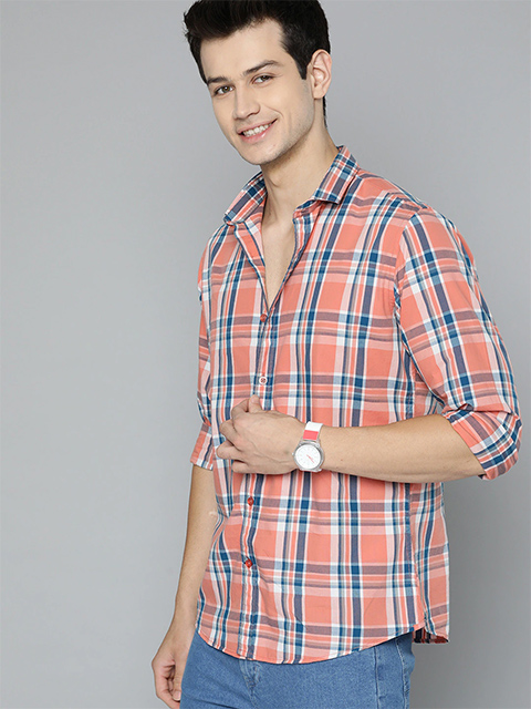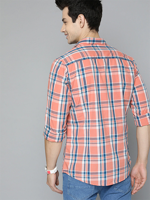 Peach-colored tartan checks opaque Casual shirt, has a spread collar, button placket, regular long sleeves, curved hem