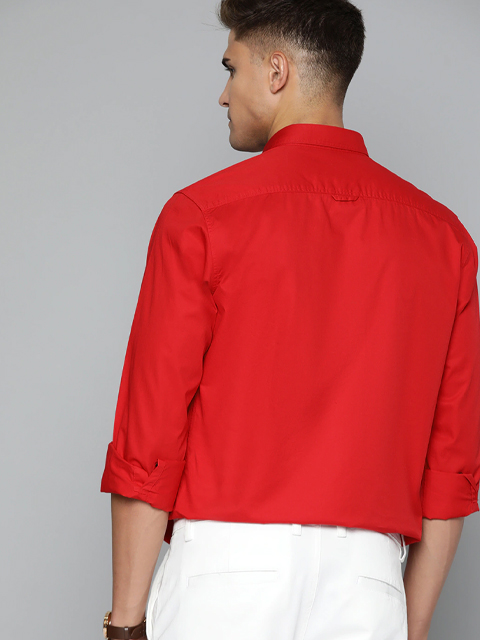 Red solid Casual shirt, has a spread collar, button placket, 1 patch pocket, regular long sleeves, curved hem