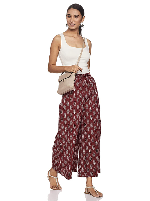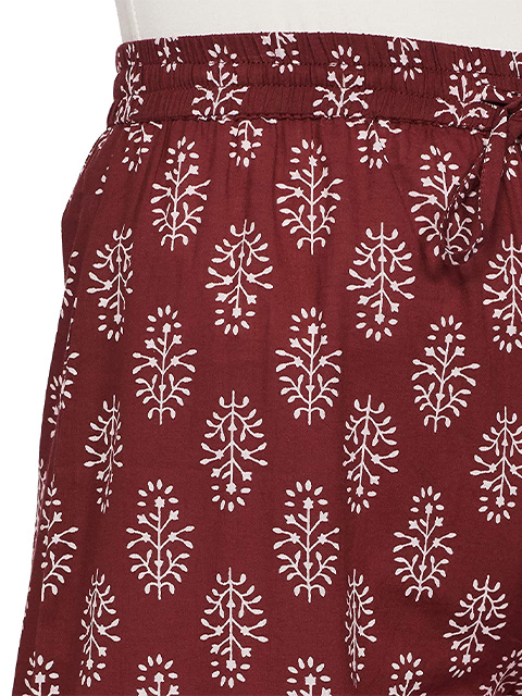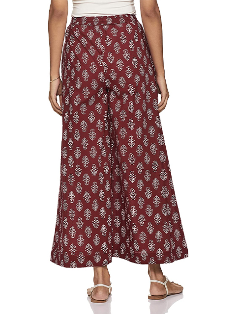 Maroon colored straight fit cotton palazzos with floral print detail and an elasticated waistband.
