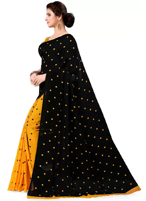Half-and-half saree with black and yellow pola dots