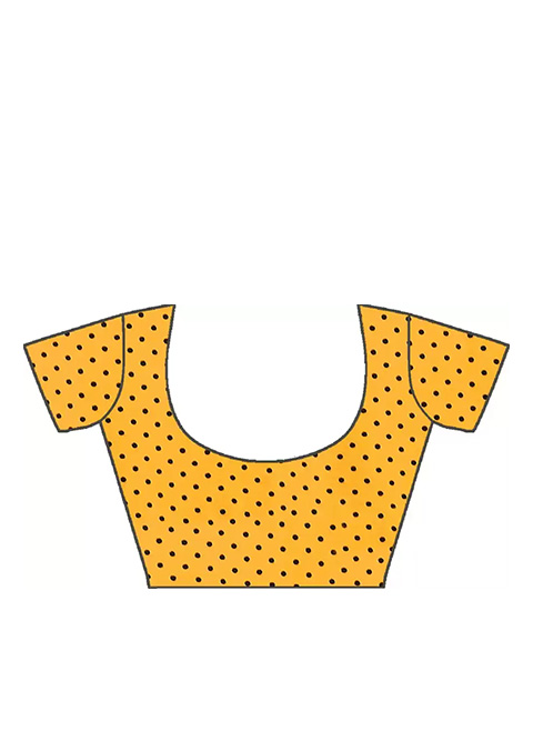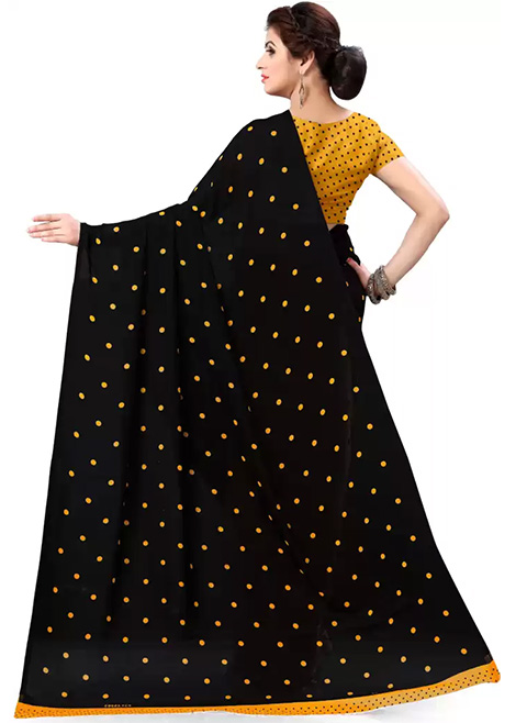 There is a black and yellow saree and a Polka Dot printed saree with no border. The saree comes with an unstitched blouse piece. It might just be for modeling purposes. You can see how the blouse piece looks in the image.