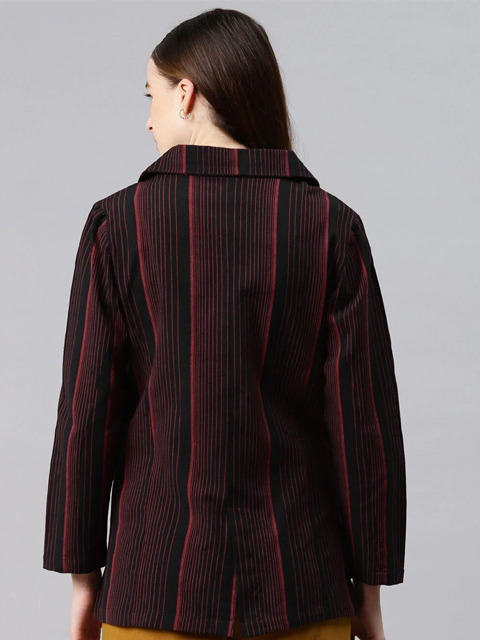 Featuring a slim fit, this cotton fabric blazer is light in weight. There is an elegant enchantment in this blazer, which features a notched lapel, full sleeves, and a striped pattern.