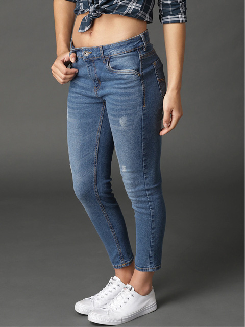 Blue medium wash 5-pocket mid-rise crop jeans, low distress with light fade, has a button and zip closure, a waistband with belt loops