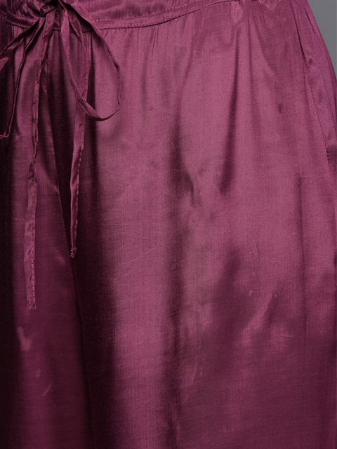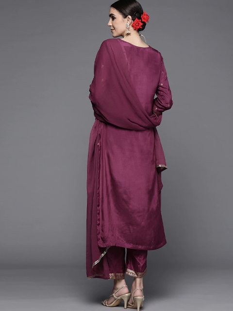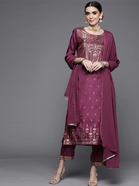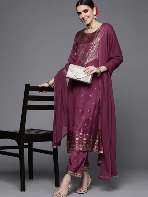 Kurta with trousers and dupatta in Maroon. This is a floral print with an A-line shape. An above knee length jacket with a Round neck, three-quarter regular sleeves, and a straight hem made of poly silk machine weave fabric.