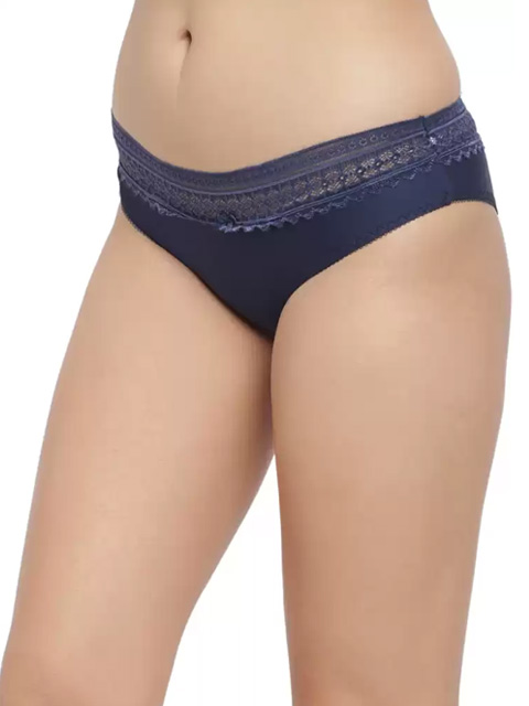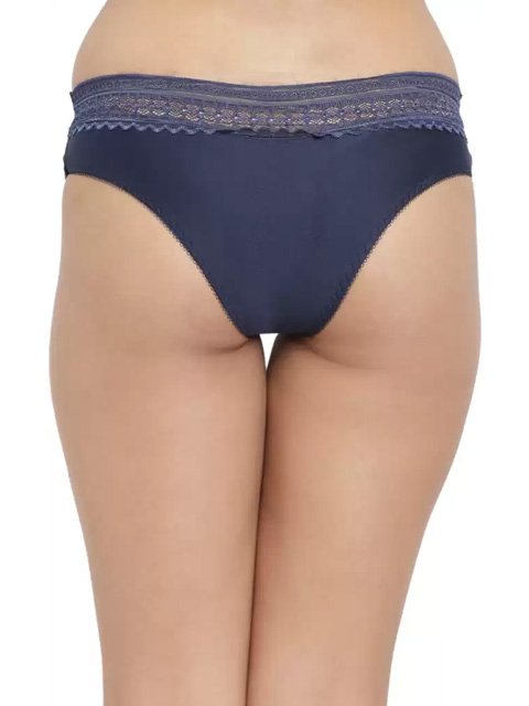 Low-rise solid navy blue hipster briefs with an inner elastic waistband and slip-on closure with leakproof technology at the crotch.