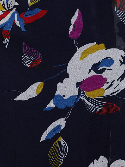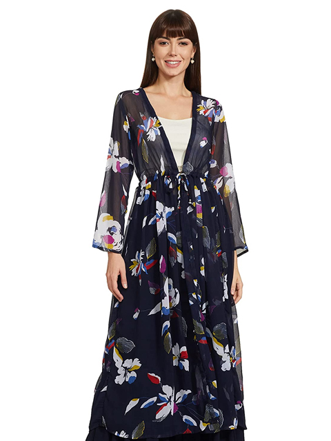 Wear this navy longline shrug to look fashionable. With its floral print pattern and fine color combination, it has a sophisticated look. Furthermore, it is made with utmost care using a high-quality fabric that ensures maximum comfort. A full sleeve adds to the design. Wear it with distressed jeans.