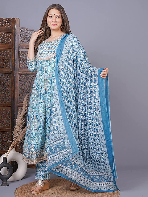Add to your wardrobe this distinctive blue color Anarkali set with printed florals and complementing dupatta paired with calming white palazzo.