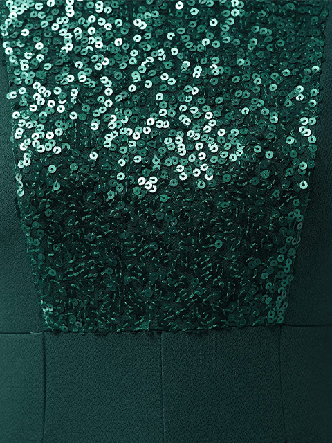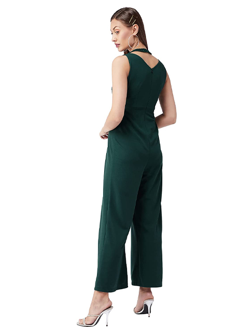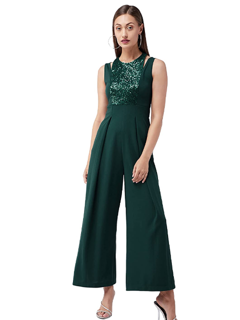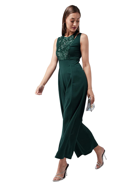 Green knitted solid regular length sequin paneled sleeveless pleated jumpsuit, Has halter neck and deep V backline.